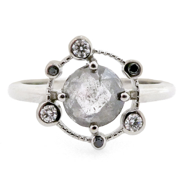 The Galaxy ring features a salt and pepper rose cut center diamond that weighs 1.05 carats, and is surrounded by an orbit style halo that contains three round brilliant cut diamonds that weigh 0.093 carats, and three round color enhanced black diamonds.
