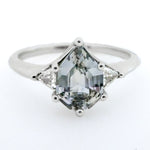 Platinum three stone style ring that features a 1.60 carat fancy shape, no heat Sri Lanka sapphire with two trillion cut diamond accents that have a total weight of 0.16 carats, G color, and SI1 clarity.