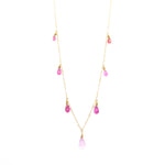 14K YELLOW GOLD BRIOLETTE DANGLE NECKLACE, WITH 7 RUBIES 3.88CTW.