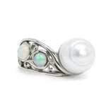 14 karat white gold ring featuring a large south sea pearl and two opal cabochon accents.
